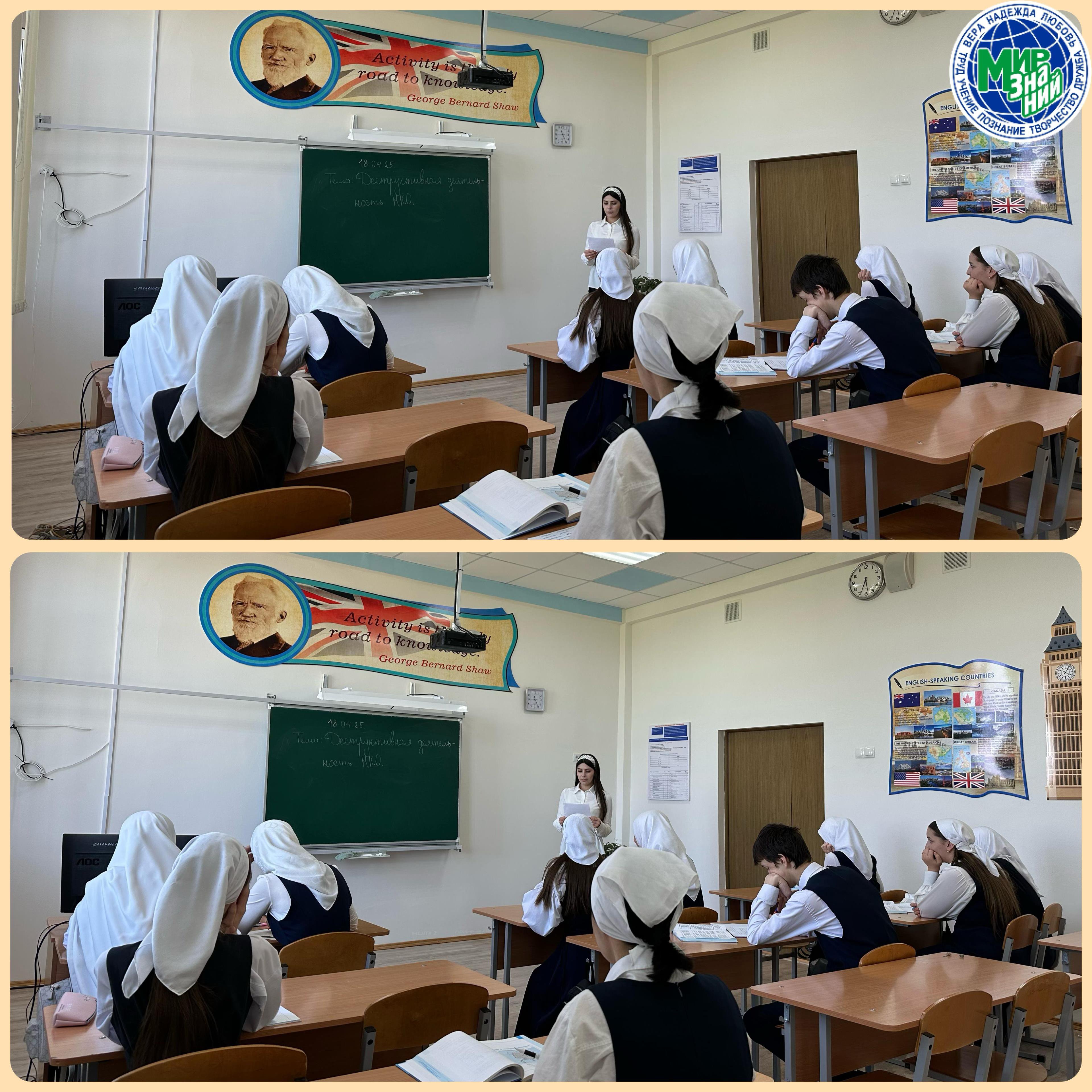 В МБОУ "СОШ "Мир знаний" с. Герменчук" прошли профилактические беседы на тему: "Деятельность некоммерческих организаций, направленная на дестабилизацию социально-политической обстановки на территории Чеченской Республики».